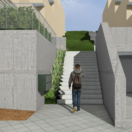 Um die Eingangssituation trotz der Sichtbetonflächen freundlich und einladend zu gestalten, wird oberhalb der Stützmauer eine Heckenbepflanzung vorgesehen. Diese dient zur natürlichen Hanggliederung.